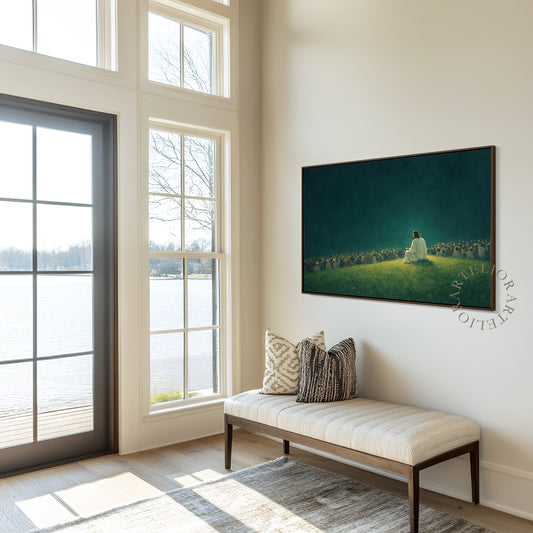 Jesus Teaching Sermon on the Mount Framed Canvas Christian Wall Art, Matthew 5 Christian Landscape Painting, Green Faith Decor | Artelior