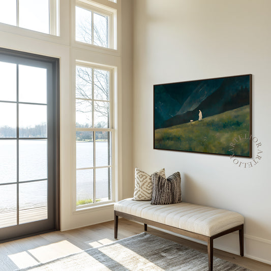 The Parable of the Lost Sheep Framed Canvas Wall Art, Luke 15 Jesus and Sheep Painting, Blue Green Christian Decor | Artelior