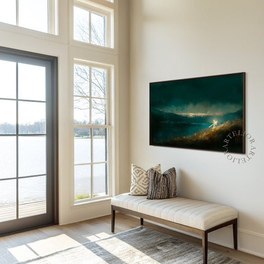 Jesus Carrying the Cross Framed Canvas Wall Art, John 8:12 Light of the World Painting, Dark Green Blue Christian Decor | Artelior