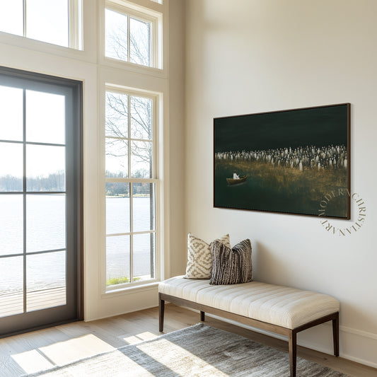 Jesus Teaching from the Boat Framed Canvas · Modern Christian Wall Art · Deep Emerald Green Painting