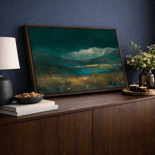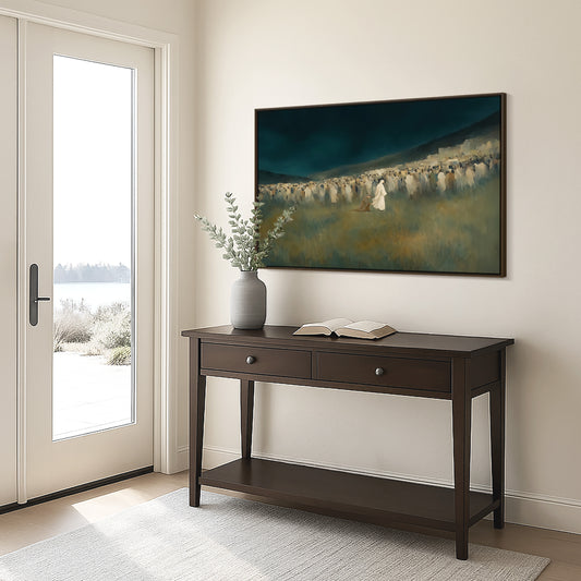 He Leads Me Beside Still Waters Framed Canvas Christian Wall Art, Psalm 23 Jesus and Sheep Emerald Green Landscape | Artelior